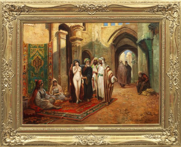 Orientalische Straßenszene mit junger Araberin als Aktfigur, die zwei Orientalen angeboten wird. Rares Genrebild Sedlaceks, der vornehmlich historisierende Rokoko-Motive schilderte und nur wenige Harems- und Sklavenmarktszenen schuf. Der exotische Zauber des Morgenlandes regte Sedlacek wie viele andere Maler in der 2. Hälfte des 19. Jhs. an, sich auch der Orientmalerei zuzuwenden. Harems- und Skavenmarktmotive mit verführerischen Akten, Odalisken und Tänzerinnen boten Gelegenheiten für erotische Darstellungen und entsprachen zugleich den westlichen Fantasien vom Orient sowie einer begehrlich-voyeuristischen Schaulust. Somit steht das vorliegende Gemälde ganz in der Tradition von Jean-Léon Gérôme und seinem berühmten "Sklavenmarkt" von 1866. Öl/Lwd.; R. u. sign.; Verso betitelt. 74 cm x 100 cm. Prunkrahmen.