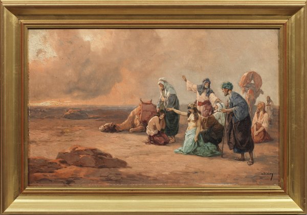 Auf ihrem Weg durch die Wüste zum Rasten gekommene Beduinen, auf ein offenbar unerreichbares Ziel oder einen am Horizont aufkommenden Sandsturm deutend. Eines Ihrer Kamele liegt bereits entkräftet am Boden. Im Orientalismus des 19. Jhs. liegt oft eine gewisse Lust des Europäischen Publikums an einer dem Orient unterstellten Sinnlichkeit. Auch hier deutet diese sich in der Kleidung der beiden jungen Frauen an. Impressionistisches Werk des Künstlers mit meisterhafter Wiedergabe der Licht- und Schattenphänomene in einer Wüstenlandschaft. 1857 erhielt Didier den bedeutenden Rompreis und stellte erstmals Landschaften im Salon in Paris aus. In den 1880er Jahren wandte er sich verstärkt Motiven aus seiner französischen Umgebung zu. Öl/Holztafel. R. u. sign.; 36,5 cm x 57,5 cm. Rahmen.