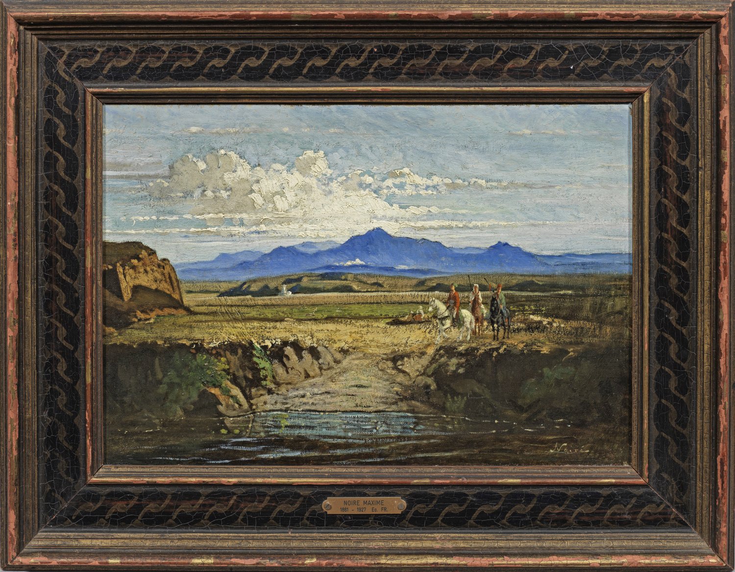 Im Hintergrund der Gebirgszug der Aurès. Noiré ließ sich um 1882 in Algier nieder, wo er als Orientmaler berühmt wurde, weite Teile Algeriens bereiste und die landschaftlichen Schönheiten der Oasen und der Aurès entdeckte. 1905 wurde Noiré zum offiziellen Maler der Marine und der Kolonien ernannt. Er stellte u. a. im Salon des Artistes français in Paris aus, überdies beschickte er 1900 die Weltausstellung in Paris. Öl/Lwd., doubl.; R. u. sign.; 27 cm x 40 cm. Rahmen.