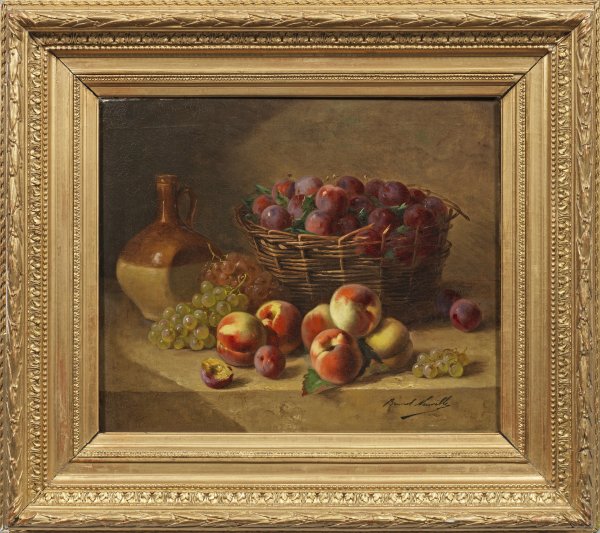 Auf einem steinernen Tisch arrangiertes Stillleben aus einem geflochtenen Korb mit Pflaumen und davor verteilten Pfirsichen und Weintrauben, auf der linken Seite flankiert von einem Enghalskrug. Realistisch gemaltes Werk des auf Früchtemotive und Katzendarstellungen spezialisierten Malers, der 1880 - 1910 des öfteren auf dem Salon aussstellte. Öl/Lwd.; R. u. sign.; 46,5 cm x 55,5 cm. Rahmen.