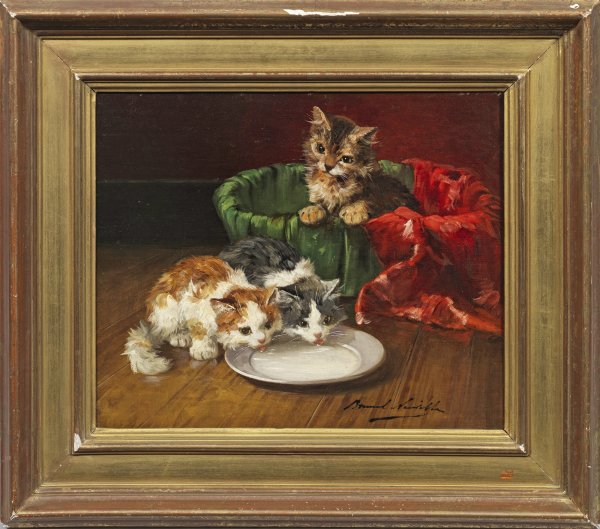 Mit lockerem Duktus gemaltes, in Motiv und Stil repräsentatives Werk des Tiermalers, der mit Vorliebe possierliche junge Katzen schilderte. Seine impressionistischen Gemälde ragen durch ihre außerordentlich liebevolle, genau studierte Wiedergabe der Tiere heraus. Öl/Lwd., auf Karton kaschiert. R. u. sign.; 38 cm x 45,5 cm. Rahmen.