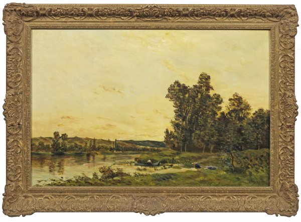 Motiv- und stiltypische, impressionistische Landschaft Delpys, der zur Schule von Barbizon gehörte, bei Daubigny lernte und von Corot gefördert wurde. Als Zeitgenosse der Impressionisten sowie befreundet mit Pissarro und Cézanne entwickelte Delpy einen lockeren Duktus für seine Landschaften, in denen er Motive aus dem Wald von Fontainebleau, der Normandie, der Seine und Yonne einfing. 1869 debütierte Delpy auf dem Salon, wo er ab 1873 regelmäßig ausstellte; 1889 nahm er an der Weltausstellung in Paris teil. Öl/Lwd., doubl.; L. u. sign.; 48,5 cm x 73 cm. Rahmen.