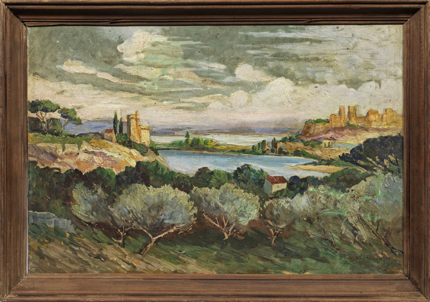Wohl Blick auf Étang de Berre bei Saint-Chamas an der Küstenregion Côte Bleue, nordwestlich von Marseille. Spätimpressionistische, von Paul Cézanne beeinflusste, mit temperamentvollem Duktus gemalte Provence-Landschaft Seyssauds, der seine erste große Ausstellung 1892 im Salon des Indépendants in Paris hatte und später auch die Ausstellungen des Salon d'Automne und Salon des Tuileries beschickte. Außer in Saint-Chamas malte er, wie Cézanne, oft am Fuße des mystischen Mont Ventoux, Mitte der 1930er Jahre gründete er auch ein Atelier in Aurel auf dem Plateaux unterhalb des Berges. Öl/Lwd.; R. u. sign.; Rest.-bedürftig. 40 cm x 60 cm. Rahmen.
