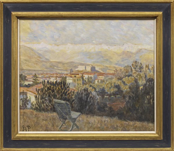 Die impressionistische Landschaft lädt den Betrachter ein, auf dem auf einer Anhöhe platzierten Gartenstuhl ein, selbst Platz zu nehmen und die Morgenstimmung sowie die Aussicht zu genießen. Die dänische Malerin lernte 1881-1883 beim Skagen-Maler Peder Severin Krøyer und bei Malthe Engelsted in Kopenhagen. 1888/89 unternahm sie weite Reisen durch Europa, Afrika, Südamerika und Westindien. Zurückgekehrt beschickte Panduro seit 1890 fast alljährlich die Charlottenburger Kunstausstellungen. Öl/Lwd.; L. u. monogr.; Verso dänisch betitelt. 50 cm x 60 cm. Rahmen.