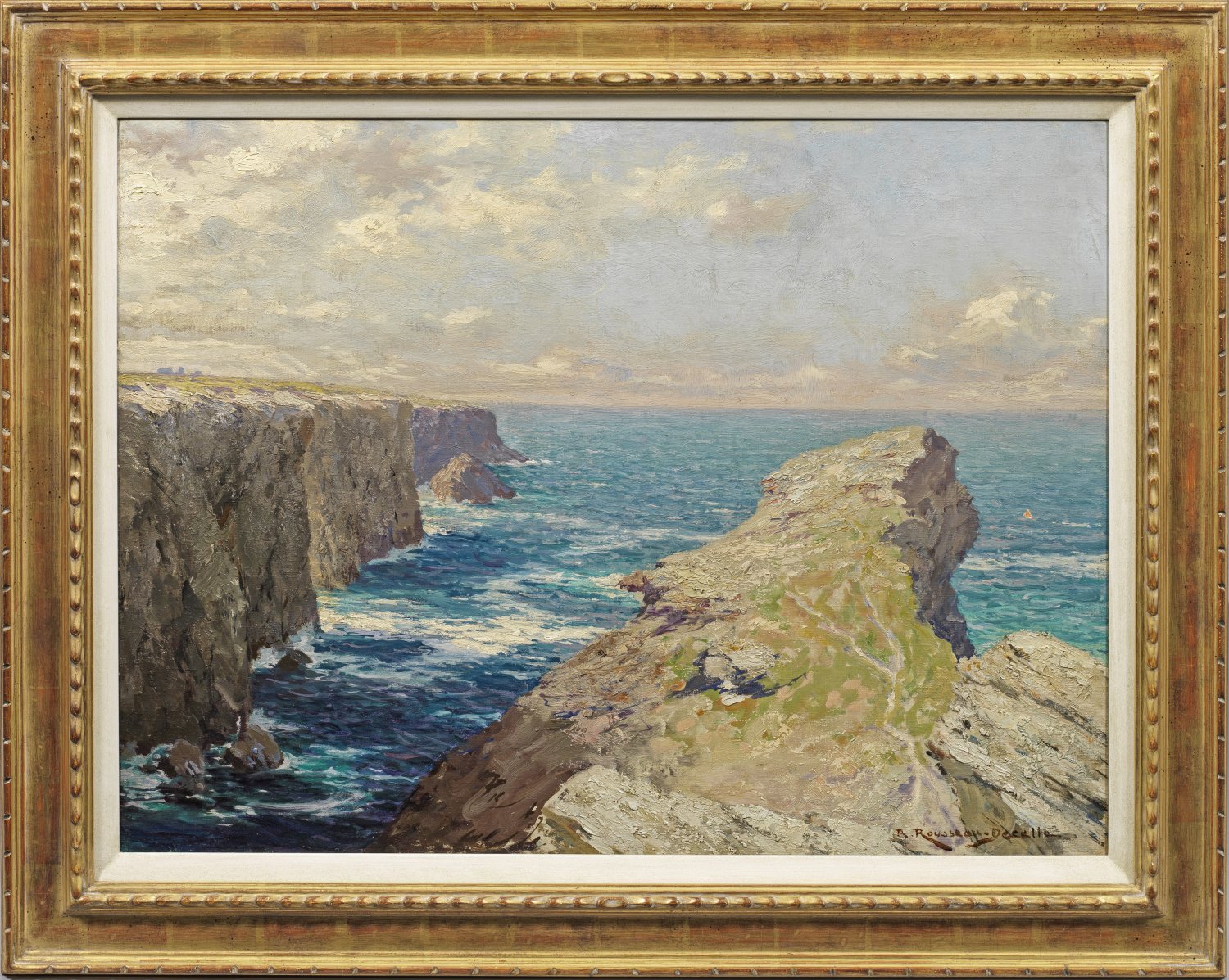 Sommerlich gestimmter, morgendlicher Blick auf die berühmte steile Felsenküste der Normandie bei Grandcamp und das Meer. Bei der mit nuanciertem Duktus, teilweise pastos gemalten Landschaft verband Rousseau-Decelle realistische und impressionistische Stilmittel, um einen möglichst eindringlichen und zugleich höchst atmosphärischen Eindruck zu vermitteln. Rousseau-Decelle war Schüler von William Bouguereau, Gabriel Ferrier, Édouard Toudouze und Marcel Baschet. Seit 1903 stellte der Künstler im Salon aus, wo er sich zunehmend von einer akademisch-elitären Malerei abwandte und zu moderneren Darstellungen fand. Zu diesem Werk mit seinem markanten Motiv wurde Rousseau-Decelle wahrscheinlich durch das berühmte Gemälde von Georges Seurat in der Tate Gallery inspiriert, der 1885 die Felsenspitze im pointillistisch bzw. divisionistischen Stil malte. Öl/Lwd.; R, u. sign.; 46 cm x 66 cm. Rahmen.
