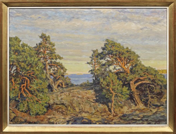 Impressionistische, mit breitem, virtuos lockerem Duktus gemalte Landschaft, welche die Stimmung eines heiteren Sommertags einfängt. Kallstenius studierte 1884 - 1888 an der Akademie in Stockholm. Bei einem anschließenden längeren Aufenthalt in der Bretagne und in Paris, lernte er aktuelle Kunstströmungen des Impressionismus kennen. Ab 1898 lehrte Kallstenius an der Akademie in Stockholm und wurde 1900 zum Mitglied der Akademie gewählt. Als Maler fand Kallstenius früh vom Realismus zur impressionistischen Stimmungsmalerei und fand einen schwedisch-romantischen Ton, oft mit Sonnenuntergängen und von der Sonne beleuchteten Küstenlandschaften. Öl/Lwd.; L. u. sign. u. dat. (19)34. 82 cm x 111 cm. Rahmen