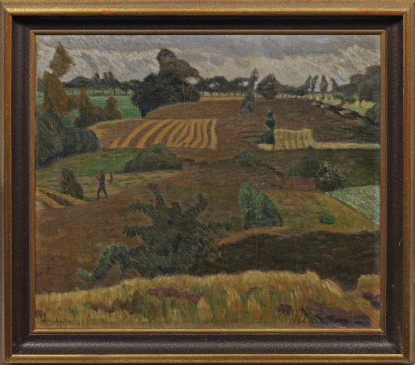 Doppelseitiges Gemälde. Das Gemälde ist Teil einer Werkreihe mit Darstellungen Modersohns von der bei Fischerhude gelegenen "Surheide". Den Künstler faszinierte die Rauheit der Natur, die Kontraste zwischen lichten, freien Sandflächen und den bewachsenen Heideflächen, Sträuchern und Bäumen. Modersohn, der 1889 zusammen mit Fritz Mackensen und Hans am Ende die Worpsweder Künstlerkolonie gegründet hatte, siedelte 1908 in das nahegelegene Dorf Fischerhude über. Dort lebte und arbeitete er bis 1943, unterbrochen nur durch die Jahre 1915 - 1917, als Modersohn mit seiner neuen Familie wieder zeitweilig nach Worpswede zurückziehen musste. Die ersten Fischerhuder Jahre 1908 - 1915 markieren zugleich einen künstlerischen Umbruch im Oeuvre Modersohns. Die Beschäftigung mit den Gemälden seiner 1907 verstorbenen Frau Paula Modersohn-Becker und der neuen französischen Kunst, insbesondere mit Cézanne, brachte ihm neue Einsichten, die er in Fischerhude umsetzte und seine Bilder als miteinander verwobene Flächen komponierte. Immer wieder malte er das Dorf selbst, die abwechlungsreiche Wümmelandschaft und die Surheide im Wechsel der Jahreszeiten und Tagesstimmungen. Die Rückseite der von Modersohn wiederverwendeten Leinwand zeigt eine um 1910 entstandene Landschaft mit Birken, Moorkate und Torfstapel an einem Moorkanal. Diese schließt sich in Motiv, Komposition und großzügigem, flächigem Stil an frühere Worpsweder Motive Otto Modersohns selbst und Paula Modersohn-Beckers an. Öl/Lwd.; L. u. sign.; 65 cm x 77 cm. Rahmen.