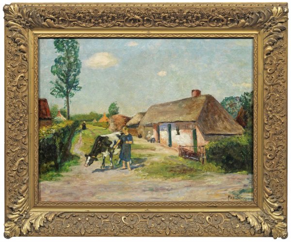 In schnellem Farbauftrag gemaltes, unmittelbar aufgefasstes, impressionistisches Werk Sterns. Der an der Akademie ausgebildete Künstler wurde wesentlich von der Haager Schule und den französischen Impressionisten beeinflusst. Schon 1893 stellte Stern als jüngster Teilnehmer in der neu gegründeten Münchener Secession aus. Zeitlebens befasste er sich mit der Darstellung des Menschen im ländlichen oder städtischen Milieu, wozu als wiederkehrendes Bildthema auch arbeitende Menschen wie Kuhhirtinnen, Bauern auf dem Feld, Fischer am Strand etc. gehörten. Wegen seiner Nähe zur französischen Kunst interessierte sich ab 1910 auch der legendäre Kunsthändler Alfred Flechtheim für Max Sterns Werke. Ab 1933 sah sich der aus einer jüdischen Familie stammende Künstler zunehmend Repressionen des NS-Regimes ausgesetzt, 1938 stürmte die SA sein Haus und zerstörte das Inventar. Öl/Lwd.; R. u. sign.; 60,5 cm x 80,5 cm. Rahmen.