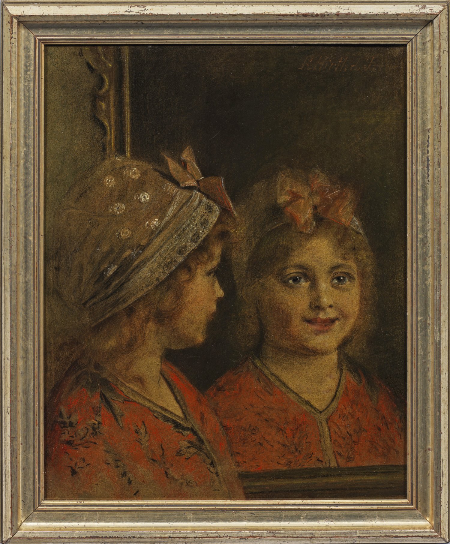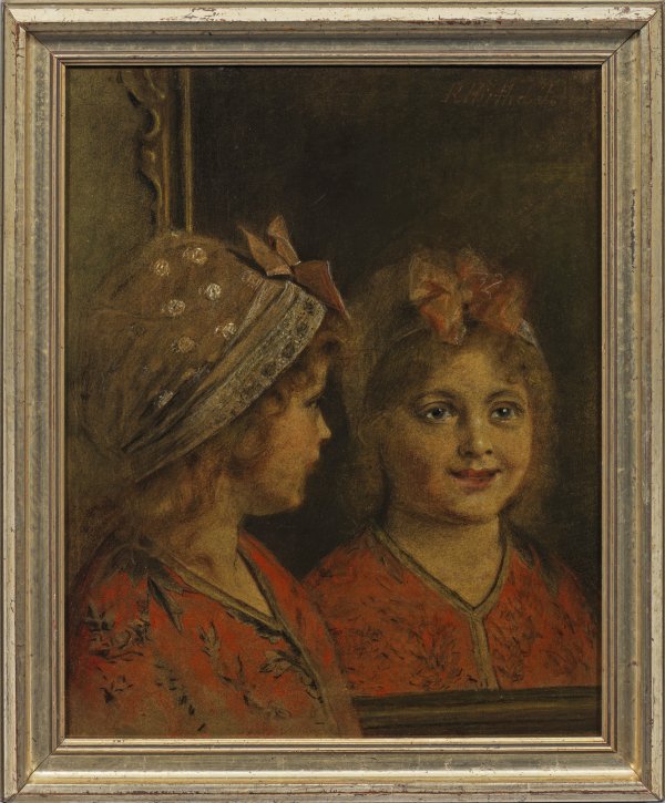 Für das hier dargestellte junge Mädchen fand der Künstler, der sich vor allem in seiner späteren Schaffensphase mit dem Porträt befasste, einen besonderen Ansatz: Der Betrachter sieht das Antlitz des Kindes nur indirekt in einem Spiegel, der die größte Fläche des Bildes einnimmt, während es auf der linken Bildseite im Profil gezeigt wird. Durch diesen Kunstgriff bringt Hirth du Frênes eine doppelte, kontemplative Reflexion des Mädchens zum Ausdruck, die mit einer offenen, positiven Zuversicht der Welt und sich selbst entgegensieht. Der Maler studierte ab 1865 an der Münchener Akademie bei Arthur von Ramberg. Mit Kommilitone Wilhelm Leibls, der ihn stark beeinflusste, gründete er ein gemeinsames Atelier in München und war wichtiges Mitglied des sog. "Leibl-Kreises". Mischtechnik/Holz. R. o. sign. R. Hirth d. Fre(...?). 46,5 cm x 37 cm. Rahmen.