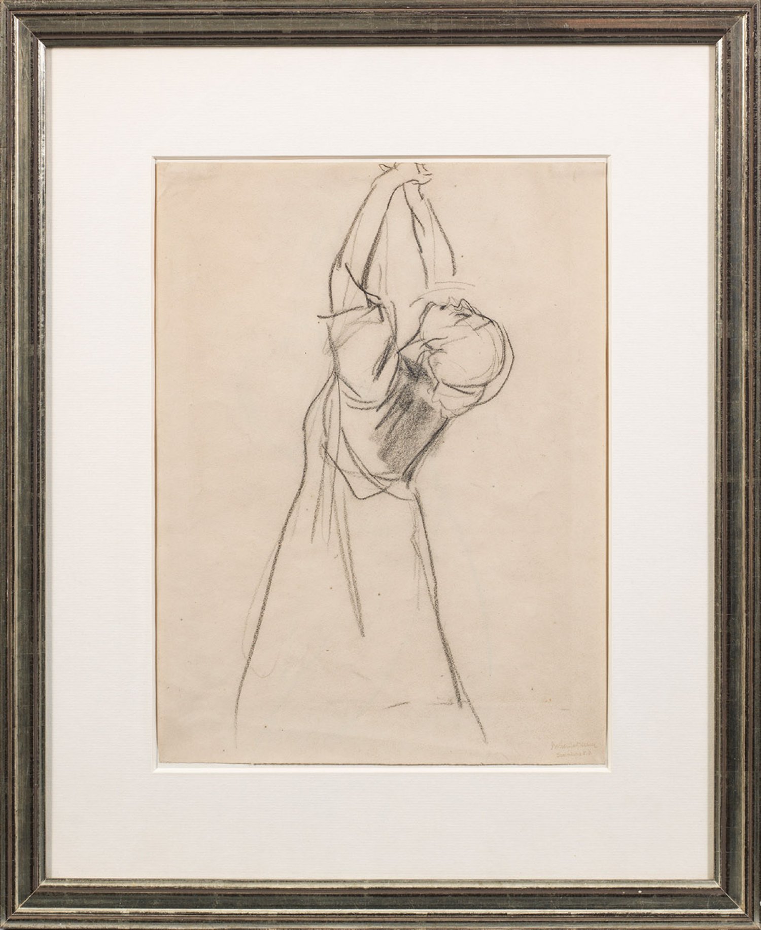 Darstellung einer stehenden Frau in Dreiviertelfigur mit flehend erhobenen Armen und zurück geneigtem Kopf. Liebermann konzentrierte sich in der umrisshaften, nur mit wenigen Schattierungen am Rücken ausgeführten Zeichnung ganz auf die expressive, ekstatistische Haltung der Figur. 1903-1905 fertigte Liebermann eine Reihe von Studien einzelner, meist weiblicher Figuren, die im Zusammenhang mit seinem Ölbild "Papst Leo XIII. [...]" (Westfälisches Landesmuseum Münster, Inv.-Nr. 1127 LM; Eberle 1906/2) stehen. Bei einem Rom-Aufenthalt 1902 hatte Liebermann selbst den dramatischen Empfang des Papstes durch Pilger erlebt; fasziniert hielt er ihn sogleich fest, schuf erste Kompositionsentwürfe und wenig später Skizzen der aus der Menge herausgelösten Pilger, die teilw. später im vollendeten Gemälde wiederkehren - in diesem Fall bei der Gruppe rechts im Vordergrund. Schwarze Kreide/Papier. R. u. Sammlerstempel von Franz Jahn (in Blaßbraun) mit Faksimile-Signatur u. Bez. "Sammlung F. J.". Verso Ausstellungs-Etikett von 1979. 34,4 cm x 26 cm. Rahmen.