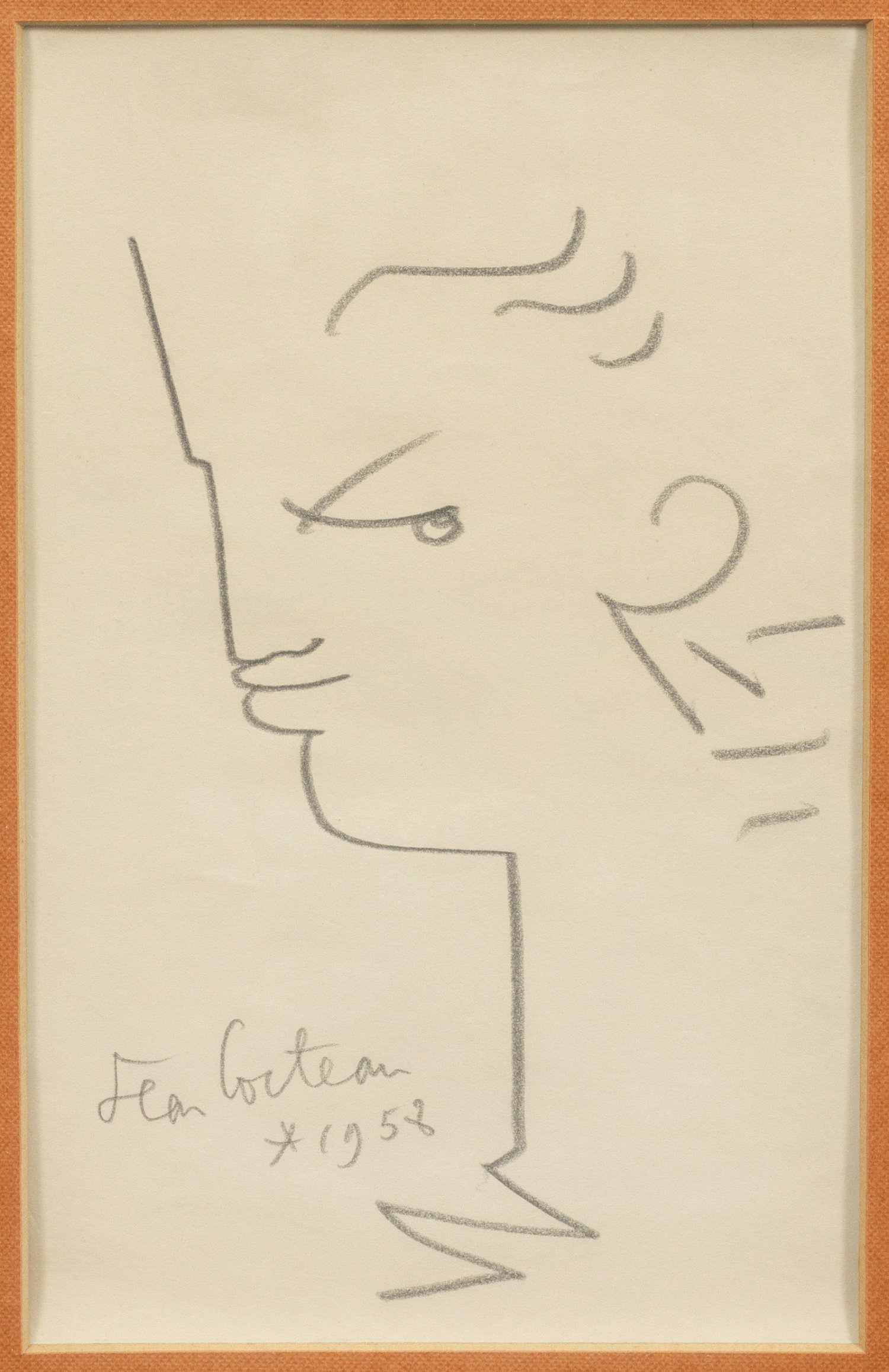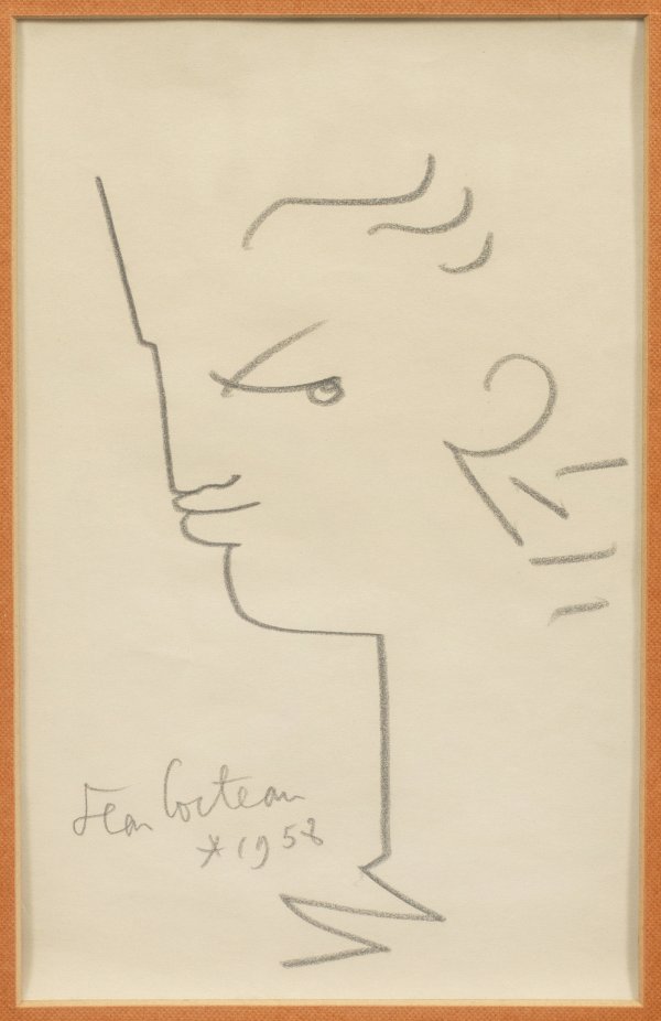 Mit wenigen, sicher gesetzten Strichen umrisshaft angelegte, motiv- und stiltypische Zeichnung des multitalentierten Universalkünstlers - Malers, Dichters, Filmregisseurs und Schauspielers, der das avantgardistische Kunst- und Geistesleben seiner Zeit prägte. Befreundet u. a. mit Picasso, Marcel Proust, Charlie Chaplin und liiert mit Jean Marais war Cocteau zudem vielfältig vernetzt und stand künstlerisch stets am Puls der Zeit. Bleistift/Papier. L. u. sign. u. dat. 1958. 20 cm x 12,5 cm (Passepartoutausschnitt). Rahmen.