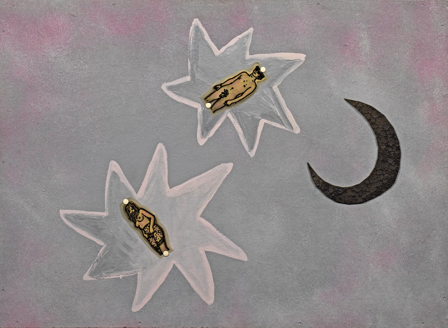 Auf grauem Grund komponierte Paeffgen einen dunklen Halbmond und zwei silberne, rosafarben umrandete Sterne, in die er jeweils einen weiblichen und männlichen Akt als erotische Motive bzw. modernes "Adam und Eva"-Paar collagierte. Frühe, 1971 enstandene, unbeschwerte Arbeit des Kölner Malers, Grafikers und Objektkünstlers, dessen Kunst wie das seines Zeitgenossen Sigmar Polke der Pop Art nahe steht. Zentrales Thema Paeffgens ist in diesem Zusammenhang die Umwandlung von vermeintlich Banalem und Normalem in Kunst. Schon ab Mitte der 1960er Jahren modifizierte Paeffgen Alltagsobjekte und verfremdete durch Überarbeitungen und konturierte, ausgeschnittene Fotos und Zeitungsbilder. Seine leicht (wieder)erkennbaren Motive verband er hierbei öfter mit einfachen Symbolen wie auf dieser Arbeit. Paeffgen, der 1992 an der documenta IX in Kassel teilnahm, ist mit Werken u. a. im Museum Folkwang in Essen, im Museum Ludwig in Köln und Von der Heydt-Museum in Wuppertal vertreten. Öl/Holz bzw. Spanplatte mit Collage, bemalter Folie u. Heftzwecken. Verso sign. u. dat. (19)71 mit Ortsangabe Köln. 62 cm x 85 cm.