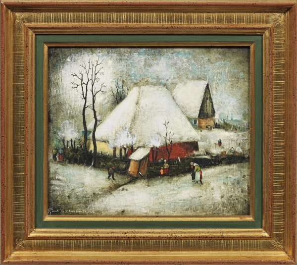 Stil- und motivtypisches Gemälde des bekannten rumänischen Künstlers, der mit Vorliebe Szenen aus dem bäuerlichen Volksleben malte und hierbei von Pieter Brueghel dem Älteren beeinflusst wurde. Vraneantu absolvierte 1965 das Institut für Bildende Künste in Bukarest und beteiligte sich ab 1967 an Gruppenausstellungen rumänischer Künstler, u. a. in Polen, Japan, Deutschland, Österreich, in den USA und in der UdSSR. Öl/Lwd.; L. u. sign. u. dat. 1982. 24,5 cm x 30 cm. Rahmen.