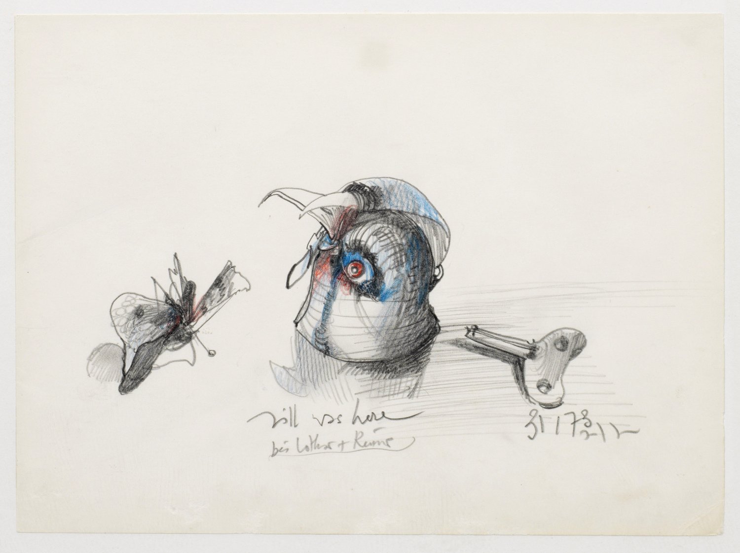 Pencil and coloured chalks on paper. Signed, dated (19)78 and inscribed or titled by the artist. Accompanied by a tin toy bird as depicted (faulty).