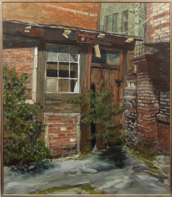 Das großformatige Gemälde zeigt einen typischen Blick in einen Berliner Hinterhof mit Bierreklame, wie er sich in den frühen 1980er Jahren - zwanzig Jahre nach dem Mauerbau - besonders in Kreuzberg zeigte, als der Stadt Gelder für die Altbausanierung fehlten. Im schnell wachsenden Berlin der Kaiserzeit war die sog. "Kreuzberger Mischung" entstanden, die das Wohnen verschiedener sozialer Schichten in Vorder-, Seitenflügel und bis zu zwei Hinterhäusern sowie Handwerksbetrieben im vierten Hinterhof unter einem Dach ermöglichte. Die Leipziger Malerin Inge Husemann knüpft in ihrer realistischen Malerei, die jeden Klinker und jede Fuge präzise erfasst, an die Berliner Künstler der 1920er Jahre wie Hans Baluschek und Ludwig Meidner an. Es gelingt Husemann nicht nur, den baulichen Verfall abzubilden, sondern gleichermaßen den Zeitgeist der 1980er Jahre in der Mauerstadt in Malerei zu bannen. Öl/Lwd.; Verso sign. und dat. 1981. 164 cm x 144 cm. Rahmen.