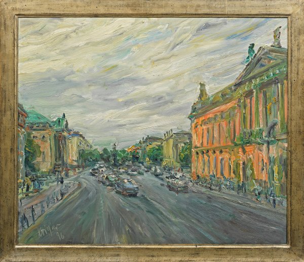 Expressiv-realistisch gemalte Straßenszene, bei der Krigar mit breitem, schnellem Duktus und teilw. pastosem Farbauftrag die Dynamik der Großstadt zum Ausdruck bringt. Krigar studierte 1972 - 1979 an der Hochschule der Künste und gehört seit 1992 der Künstlergruppe der Norddeutschen Realisten an. Ab 1994 beschickte er zahlreiche Gruppen- und Einzelausstellungen in Galerien und Museen, darunter im Schleswig-Holsteinischen Landesmuseum in Schloss Gottorf, Schleswig. Mit Vorliebe stellte Krigar das turbulente Leben in Berlin und anderen Städten dar. Öl/Lwd.; L. u. sign. u. dat. (19)96. 101 cm x 120 cm. Rahmen.