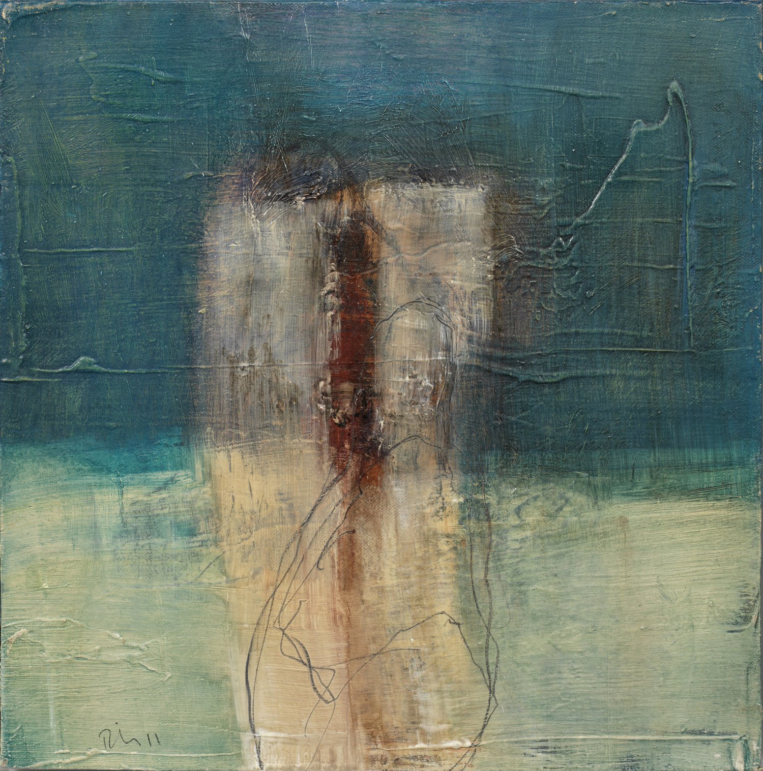 Abstrakte Komposition mit changierenden, verwischten und überlagerten Farbflächen, die sich mittig verdichten und durch zeichnerische Elemente figurative Assoziationen evozieren. Ritter studierte an der Fachhochschule Hannover bei Prof. Redeker, seit 1990 hatte der Freischaffende zahlreiche internationale und nationale Einzel- und Gruppenausstellungen in Deutschland, Europa und in den USA. Öl/Lwd.; L. u. sign. und dat. (20)11. 40 cm x 40 cm. Rahmen.