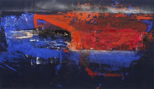 Maria Moser gestaltete ihre abstrakt-expressionistische Arbeit auf einer nachtblauen Leinwand im breiten Querformat, wobei sie durch dynamische, teilweise pastos aufgetragene, große, leuchtendblaue und glühendrote Farbspuren und Flächen beim Betrachter assoziative Impulse auslöst. Die Malerin studierte 1968 - 1973 an der Wiener Akademie, der sich 1974/75 ein Ägypten-Aufenthalt anschloss. Viele Auszeichnungen seit 1973 sowie Einzel- und Gruppenausstellungen seit 1979, u. a. im Künstlerhaus in Wien und im Landesmuseum in Linz, festigten ihren Rang in der deutsch-österreichischen Kunstszene. 1997 erhielt Moser den oberösterreichischen Landeskulturpreis für Bildende Kunst, Ende 2004 eine Ausstellung von Großformaten im Palais Harrach in Wien. Öl/Lwd.; R. u. sign.; 80 cm x 140 cm. Rahmen.