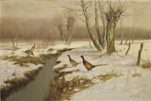 Mit schnellem, lockerem Duktus gemaltes Motiv des bekannten Jagd-, Tier- und Landschaftsmalers. Schatz widmete sich besonders der Darstellung von Wildtieren in der Bewegung, die er in spätimpressionistischen, weichzeichnenden Gemälden schilderte. Öl/Lwd.; R. u. sign.; 60 cm x 90 cm.