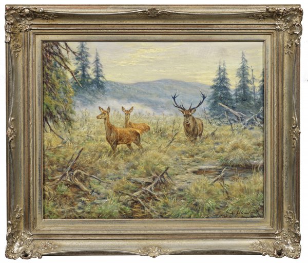 Realistisches Tierbild Löbenbergs, der mit Vorliebe Rothirsche malte. Ausgebildet an den Akademien in Königsberg und Berlin, wurde Löbenberg im "Dritten Reich" ein favorisierter Künstler des Reichsmarschalls und Reichsjägermeisters Hermann Göring. Öl/Lwd.; R. u. sign.; 40 cm x 50 cm. Rahmen.
