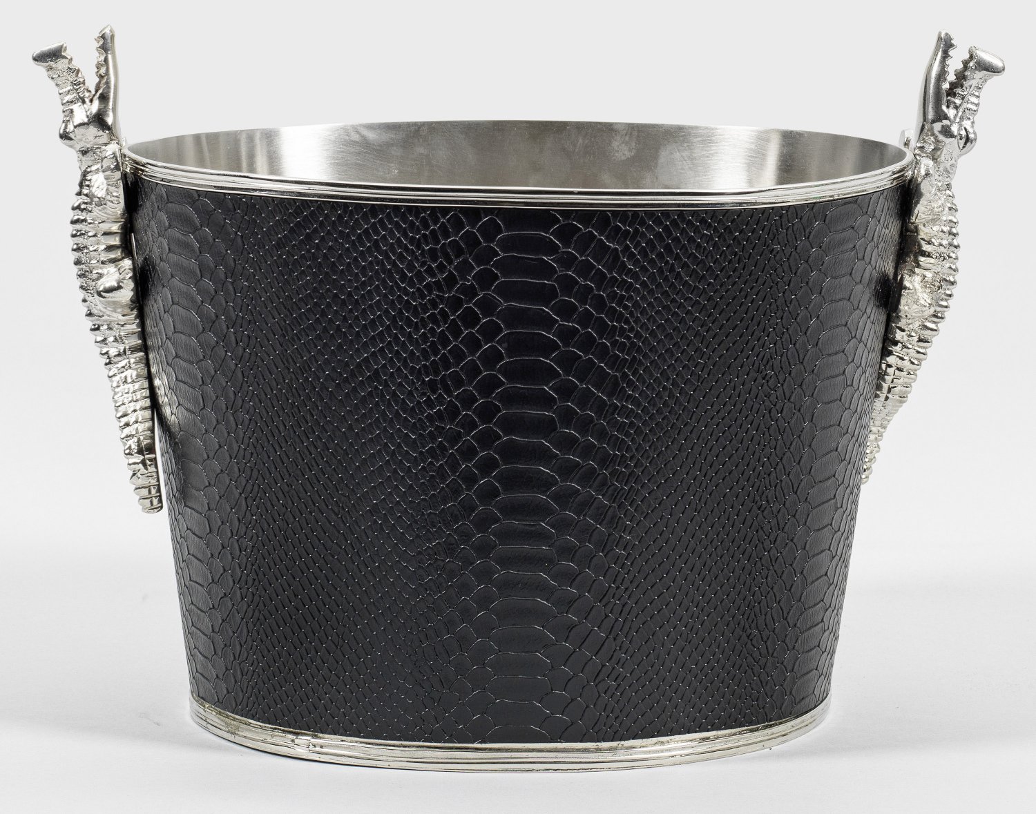 Polierter Edelstahl und schwarzes, in Kroko-Optik geprägtes Leder. Ovaler, sich leicht weitender, umlaufend profilierter Korpus mit seitlichen Handhaben in Gestalt von vollplastisch gearbeiteten Krokodilen. H. 25 cm. 35 cm x 23,5 cm.