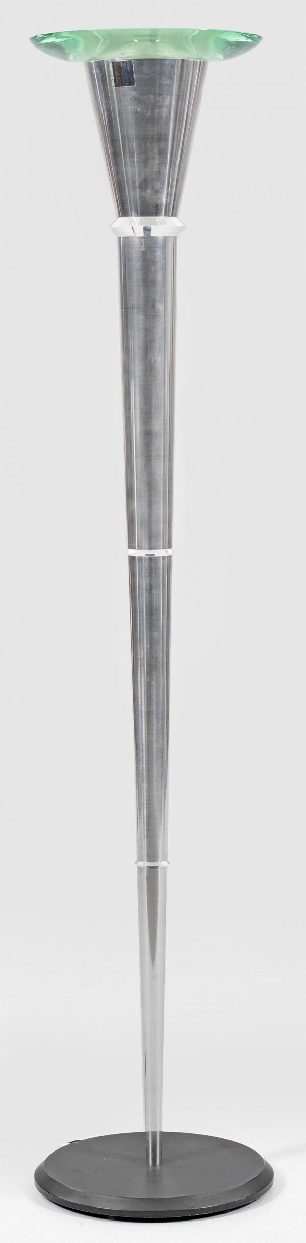 Handwerkliche Einzelanfertigung. 1-flg.; Poliertes Aluminium, hellgrünes Plexiglas und dunkelgrauer Marmor. Über flachem Rundsockel sich konisch weitender Schaft als Träger für Leuchtmittel. Elektrifiziert. Herstellerzeichen. Entw. Peter Preller 1980er Jahre für Wolfgang Joop. H. 184 cm.