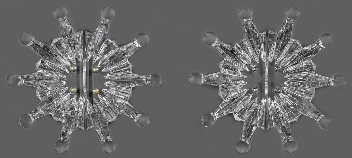 Gegenstücke für eine Doppeltür aus der Kollektion "Soleil" für Lalique Maison. Farbloses Kristallglas. Großer, gewölbter, rückseitig facettierter Korpus mit strahlenförmigen Ausläufern und Kugelabschlüssen, der bei Montage an einer zweiflügligen Tür ein großes Sonnenmotiv ergibt. Sign. Lalique France. NP € 25.000,-. Pro Griff ca. 25 cm x 48 cm.