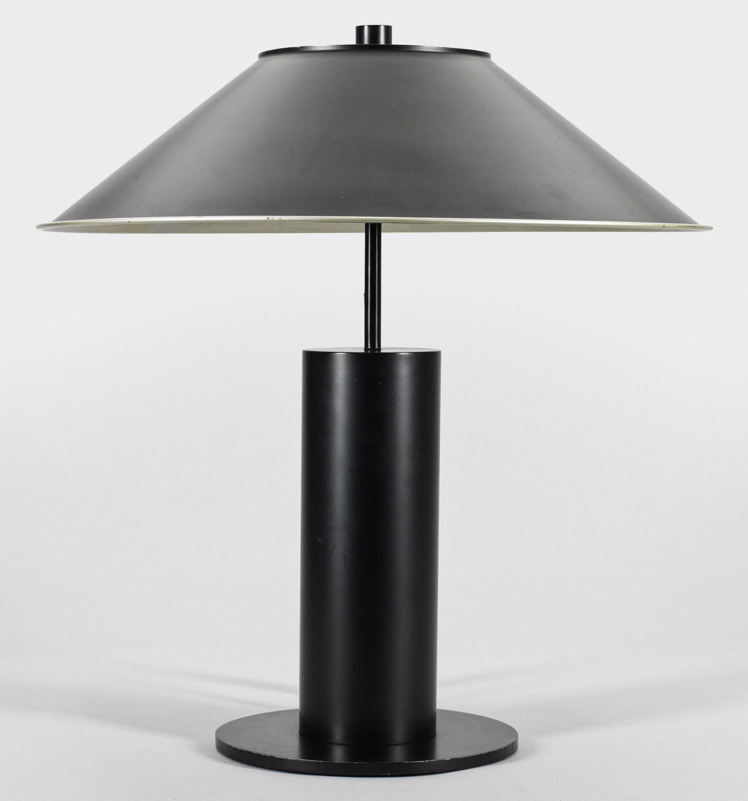 2-flg.; Metall, schwarz lackiert. Über flachem Rundsockel zylinderförmiger Korpus sowie schlanker Schaft als Träger für Leuchtmittel. Flacher, konisch zulaufender Lampenschirm. Elektrifiziert. Herstellerzeichen, Entw. Peter Preller, 1980er Jahre. H. 58 cm.