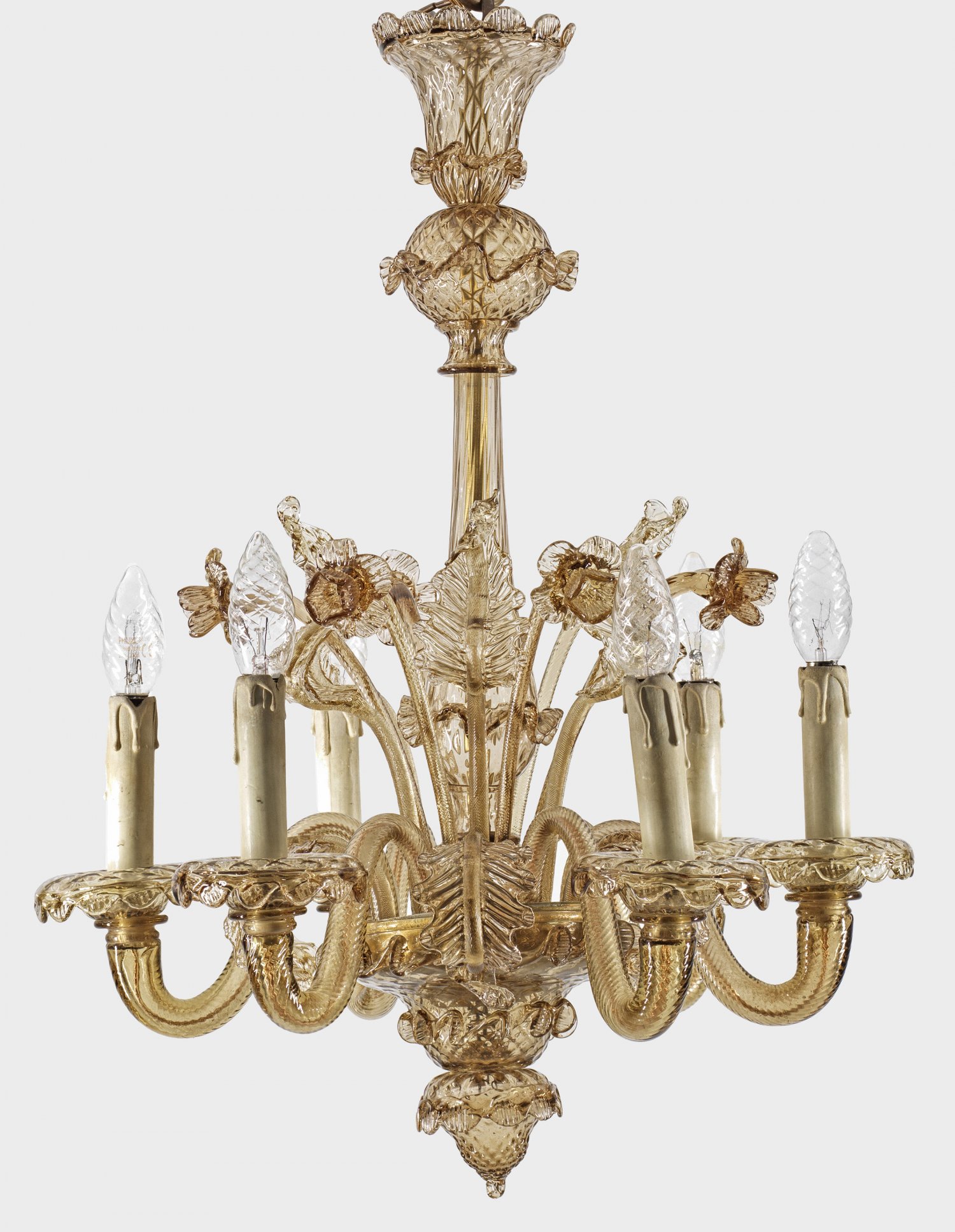 6-flg.; Rauchquarzfarbenes Muranoglas. Mehrfach gegliederter Balusterschaft, unterhalb davon ausgehend stark geschwungene Leuchterarme als Träger für Leuchtmittel, umgeben von Dekorationen aus gestreckten Blüten und Blattwerk. Elektrifiziert. H. 65 cm. D. 47 cm.