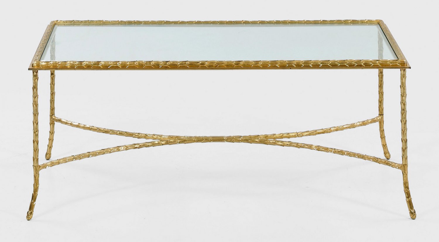 Bronze, vergoldet. Gestell aus schlanken, flächendeckend mit reliefierten Lorbeerblättern reliefierten Rundstäben als Träger für korrespondierende, quadratische Zarge mit eingelegter Glasplatte. Unterhalb bez. "CHARLES made in France". H. 43 cm. 105 cm x 55 cm.