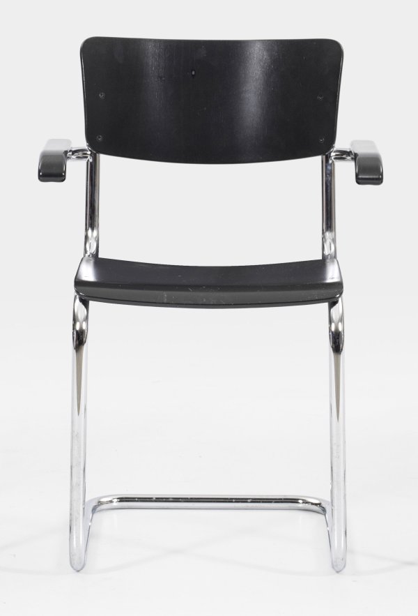 Stahlrohr, verchromt und schwarz lackiertes Holz. Gestell aus gebogten Rundstäben als Träger für schmale Armlehnen sowie leicht gewölbte Sitz- und Lehnenfläche. Herstellerzeichen. Entw. Mart Stam, 1931. Sitz-H. 47 cm.