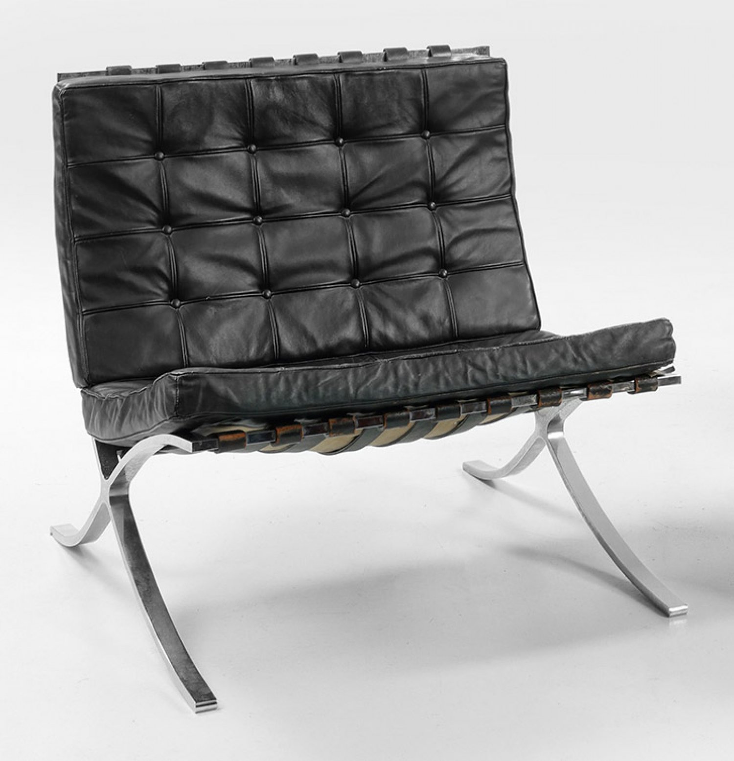 Verchromter Stahl und schwarzes Leder. Gestell aus flachen, leicht geschwungenen Streben. Breite, verschraubte Ledergurte als Auflage für rechteckige Polster. Unbez.; Entw. Ludwig Mies van der Rohe, 1929. Starke Altersspuren und teilw. besch.; H. 74 cm. 75 cm x 76 cm. Sitz-H. 40 cm.