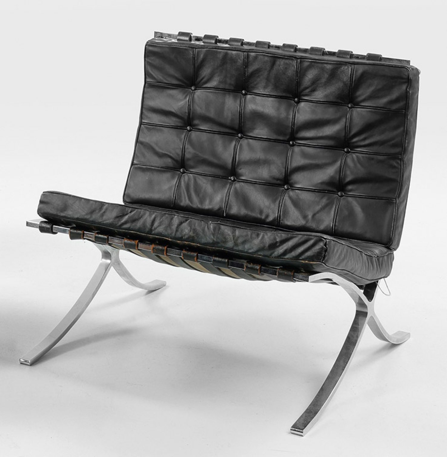 Verchromter Stahl und schwarzes Leder. Gestell aus flachen, leicht geschwungenen Streben. Breite, verschraubte Ledergurte als Auflage für rechteckige Polster. Unbez.; Entw. Ludwig Mies van der Rohe, 1929. Starke Altersspuren und teilw. besch.; H. 74 cm. 75 cm x 76 cm. Sitz-H. 40 cm.