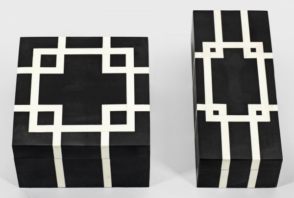 Schwarzes und cremefarbenes Resin. Quadratischer bzw. rechteckiger Korpus mit entsprechendem Deckel. Dekor aus gekanteten Bandeinlagen. H. 13 cm. 21 cm x 21 cm. bzw. 9 cm. 30 cm x 13 cm.