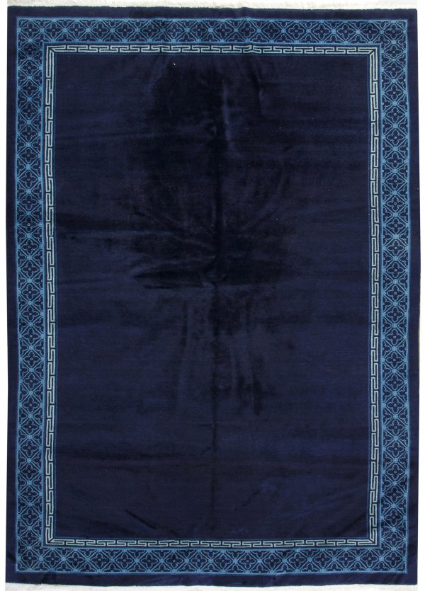 China. Wolle auf Baumwolle. Monochromes, tintenblaues Innenfeld. Umlaufend breite, hellblaue Bordüre aus Rosettenmotiven, begleitet von Mäanderband. 265 cm x 150 cm.