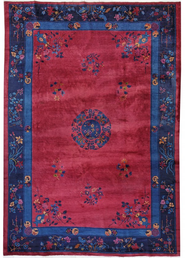 China. Mitte 20. Jh.; Wolle auf Baumwolle. Im himbeerfarbenen, monochromen Innenfeld zentrales Rundmedaillon mit Blüten sowie Musterung aus lose gestreuten Blütenzweigen und Vasen. Umlaufend breite Bordüre aus zweifarbigem Blau mit entsprechendem Dekor. 270 cm x 365 cm.