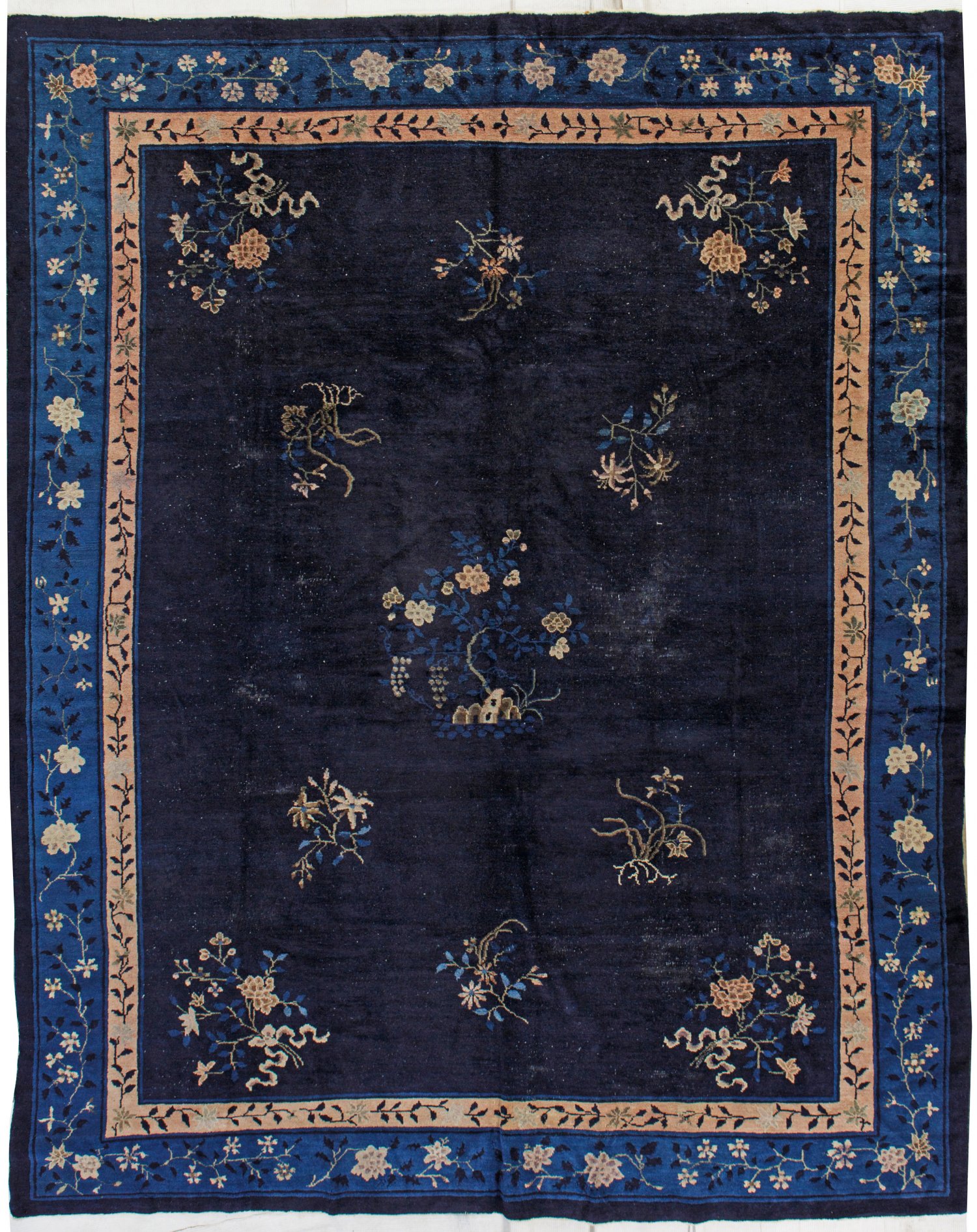 China. Um 1920. Wolle auf Baumwolle. Im tintenblauen, monochromen Innenfeld lose gestreute Blütenzweige. Umlaufend blaue Bordüre aus Päonienblüten, flankiert von lachsfarbener Nebenbordüre. Altersspuren. 350 cm x 280 cm.