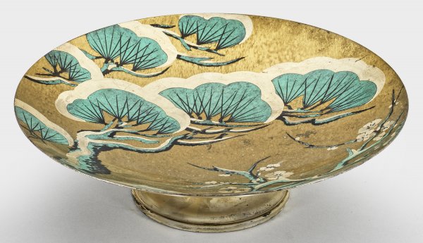 Messing, in unterschiedlichen Techniken dekoriert. Geschweift ansteigender Sockel als Träger für flachgewölbte Schale. Herstellerzeichen. Entw. Prof. Paul Haustein. H. 10 cm. D. 35,5 cm.