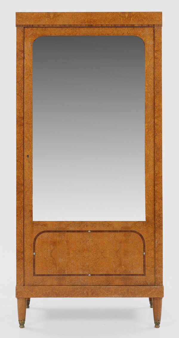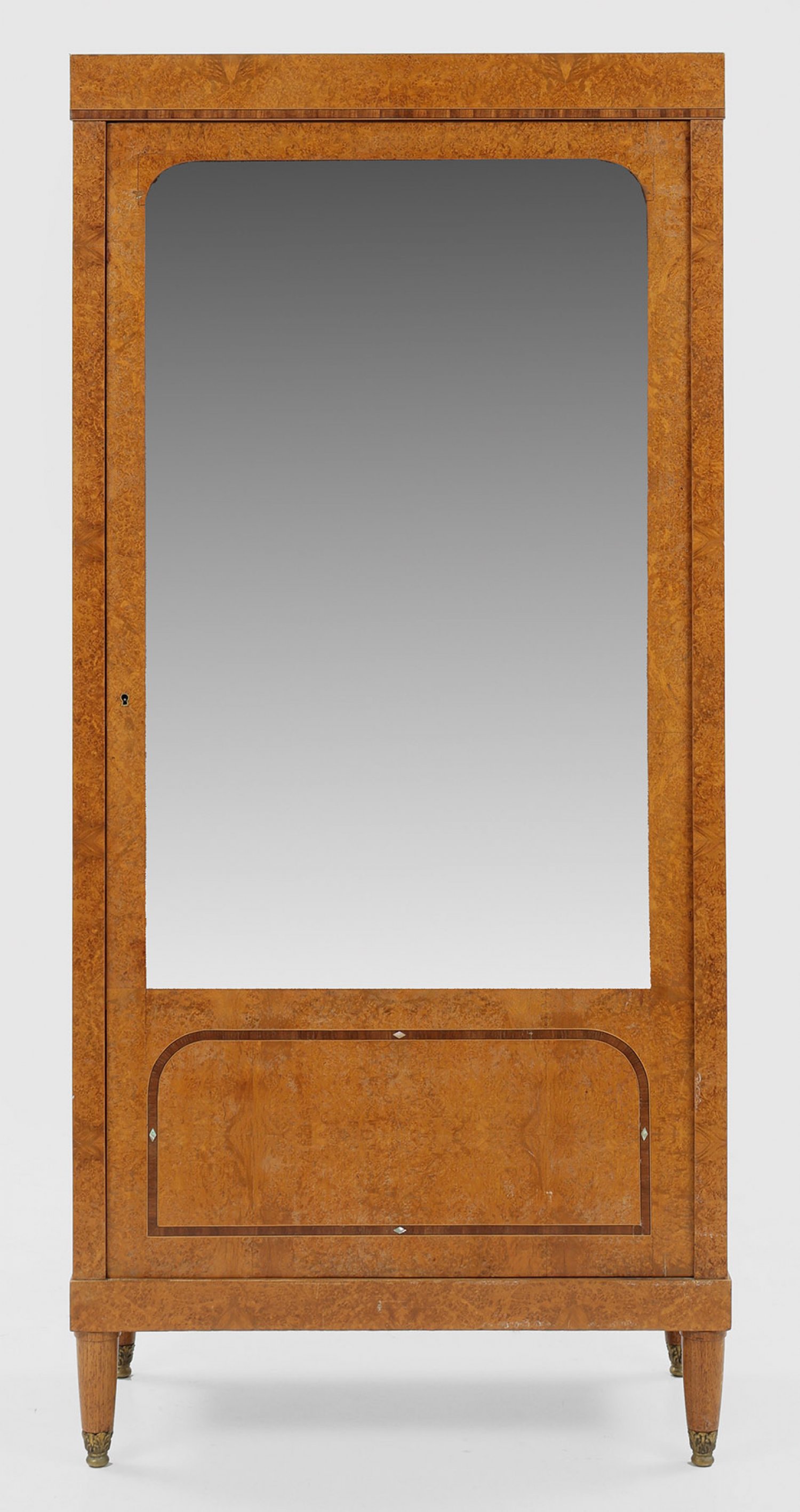 Nussbaummaser, furniert. Gerader, hochrechteckiger, dreiseitig facettverglaster Korpus auf konischen Rundbeinen. In der gegliederten Front große Vitrinentür sowie innen verspiegelte Rückwand und Einlegeböden aus Glas. H. 172 cm. 80 cm x 40 cm.