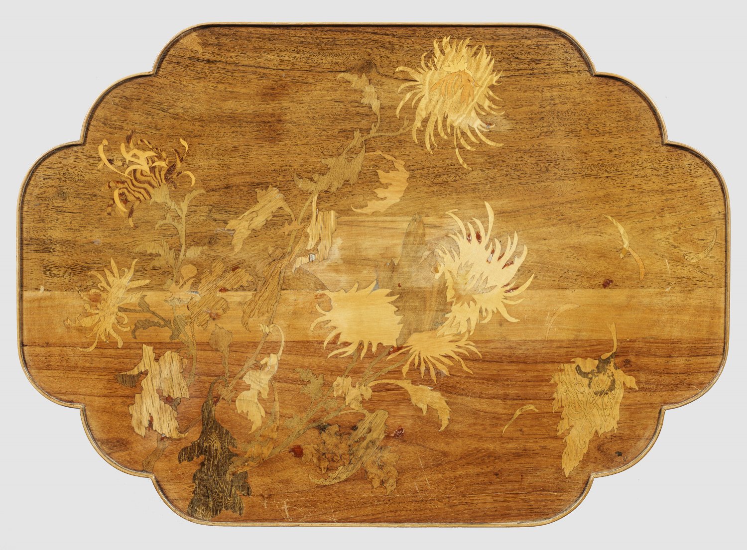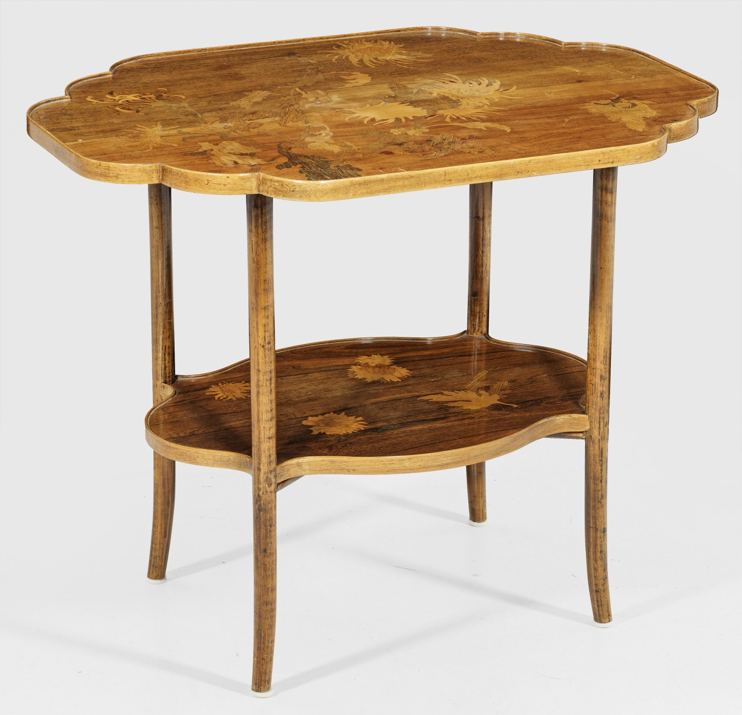 Mahagoni, Nussbaum und Rosenholz, furniert sowie Einlagen aus unterschiedlichen, teilw. gefärbten Edelhölzern. Leicht ausgestellte Rundbeine als Träger für passig geschweifte Deckplatte mit flacher Galerierahmung. Flächendeckende Marketerie aus großzügig angelegten Chrysanthemen. Eingelegtes Lothringer Kreuz sowie "E Gallé Nancy". Unterhalb korrespondierendes Ablagefach. H. 63,5 cm. 78,5 cm x 55,5 cm.