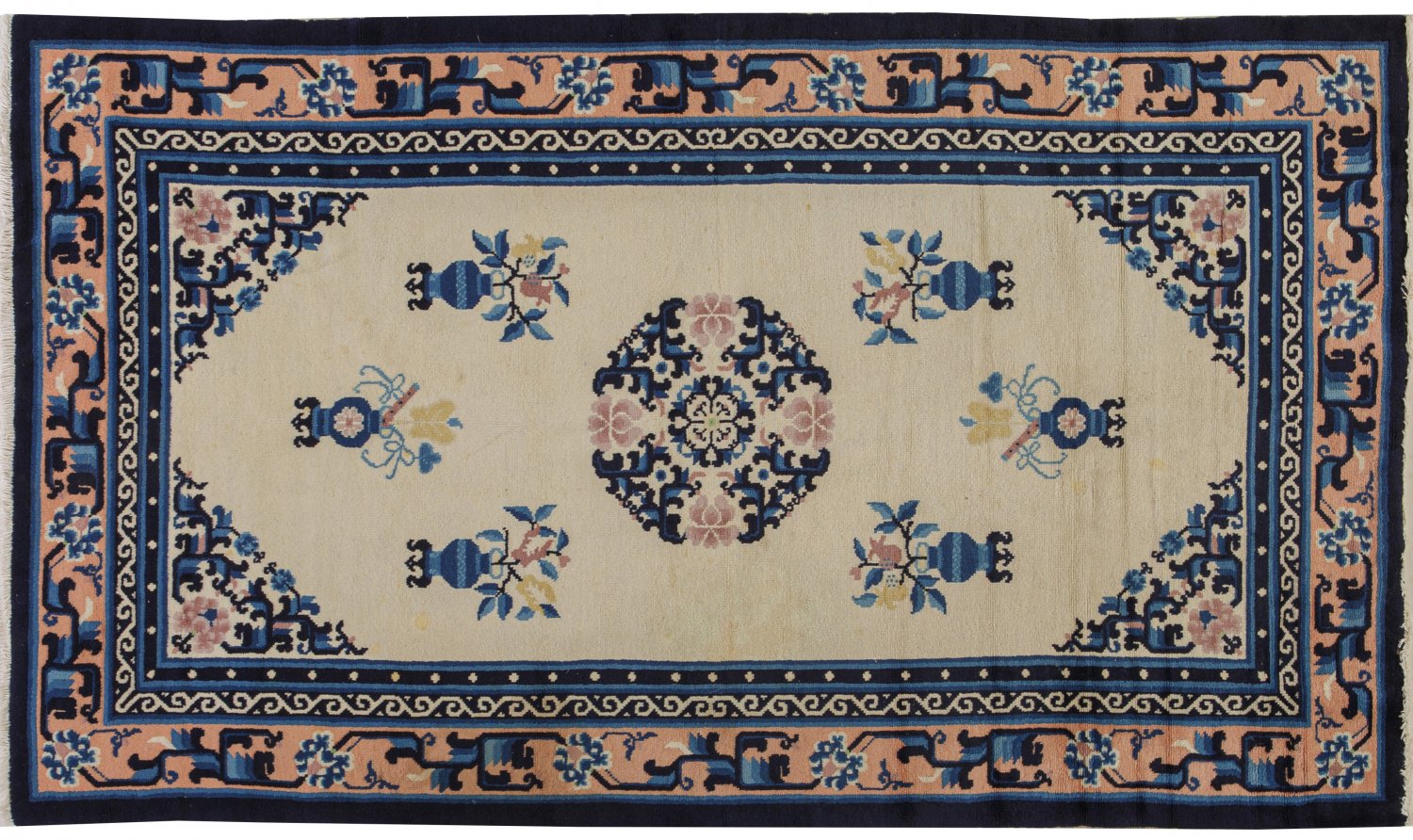 China. Wolle auf Baumwolle. Im cremefarbenen, monochromen Innenfeld Zentralmedaillon aus Lotus sowie Musterung aus blütengefüllten Vasen. Korrespondierende Ecklösungen. Umlaufend lachsfarbene Bordüre. 210 cm x 124 cm.