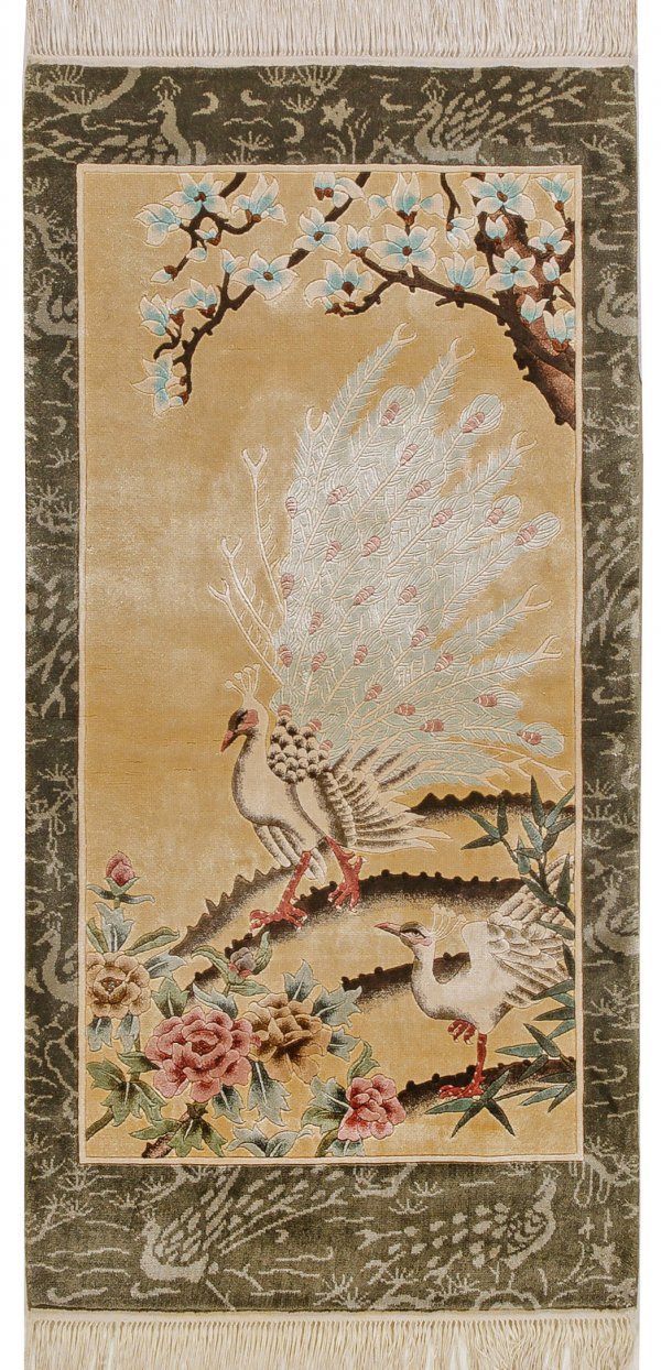 China. Seide auf Seide. Auf hellgelbem Fond flächendeckende Landschaftsdarstellung mit Pfauenpaar. Umlaufend breite, olivgrüne Bordüre mit entsprechend stilisierter Musterung. 62 cm x 125 cm.