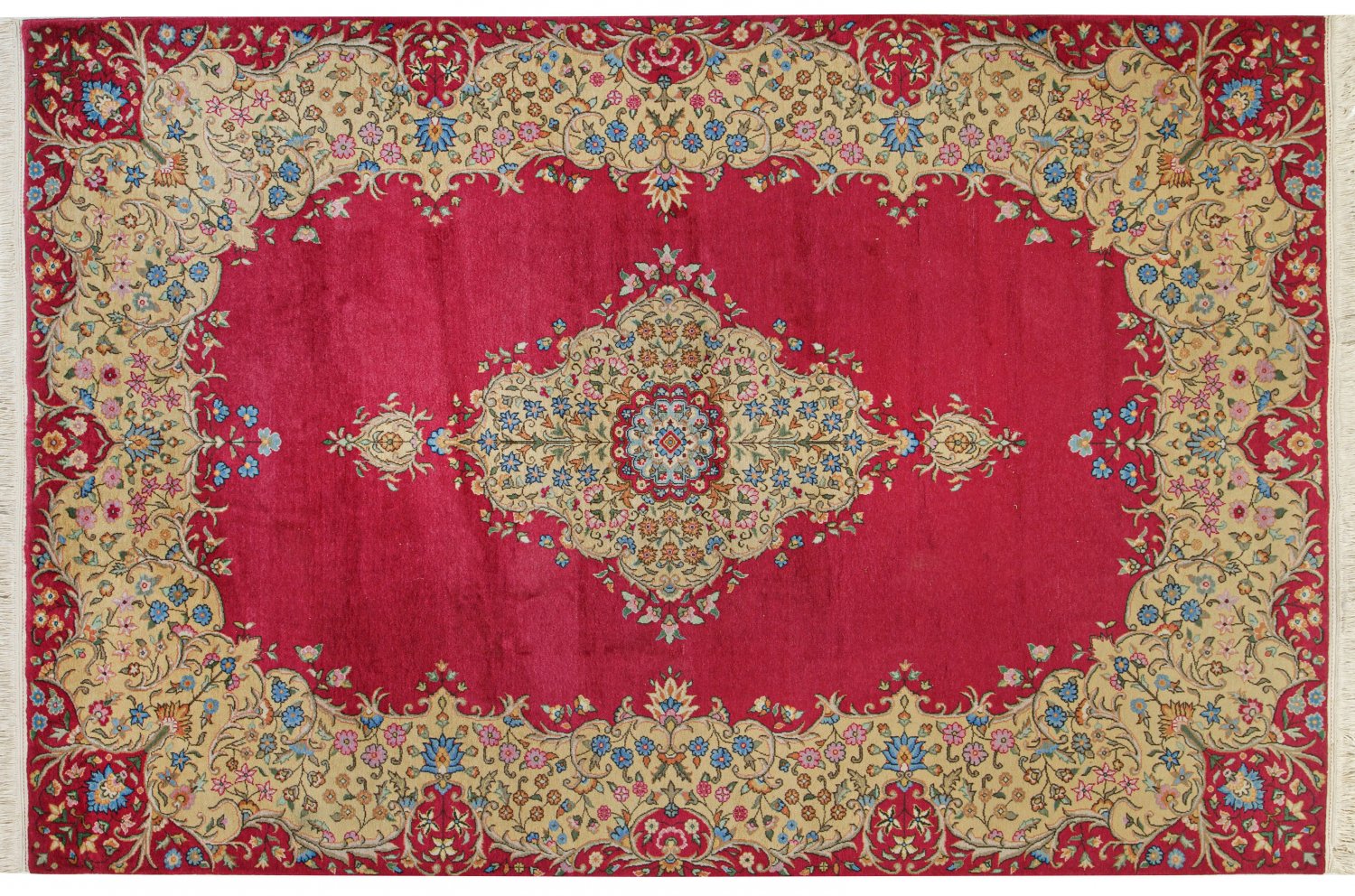 Persien. Wolle auf Baumwolle. Auf leuchtend rotem, monochromem Fond hellgelbes, gestrecktes Zentralmedaillon mit Anhängern und dichter Blüten-Musterung. Umlaufend breite, passig geschweifte Rahmung. 302 cm x 202 cm.