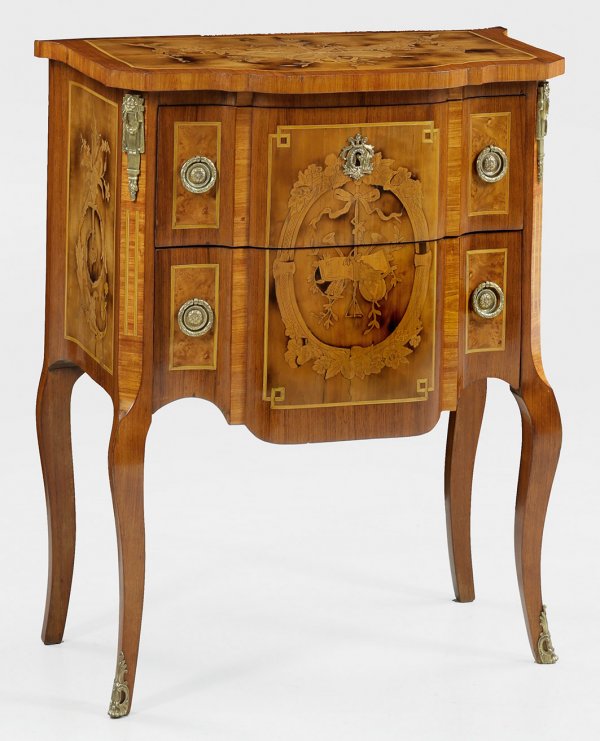 Palisander und Rosenholz, furniert sowie Einlagen aus unterschiedlichen Edelhölzern. Seitlich leicht ausschwingender Korpus, flankiert von schräggestellten Ecklisenen, in hohe, geschweifte Beine übergehend. In der gegliederten Front zwei optisch verbundene Schubladen sans traverse. Korrespondierende Deckplatte. Flächendeckend breit gerahmte Furnierfelder sowie intarsierte Attribute der Musik, von Bandeinlagen begrenzt. H. 88,5 cm. 74 cm x 42 cm.