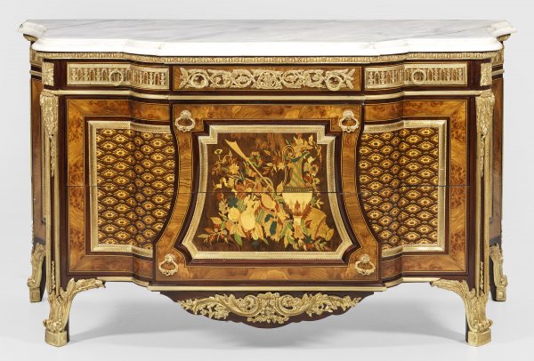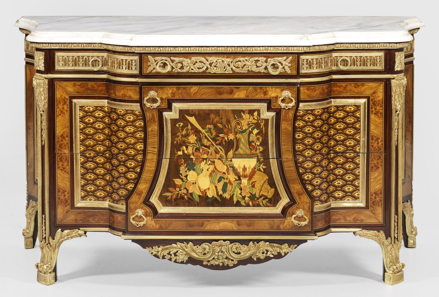 Mahagoni und Nussbaummaser, furniert sowie Marketerie aus unterschiedlichen, teilw. gefärbten Hölzern. Querrechteckig angelegter, seitlich konkav eingezogener Korpus, flankiert von schräggestellten Ecklisenen auf Blattvoluten. In der gegliederten Front drei teilw. optisch verbundene Schubladen sans et avec traverse unterschiedlicher Größe. Flächendeckend profilgerahmte Felder aus blütengefüllter Rautenmarketerie sowie schauseitig intarsiertes Stillleben aus Vasenmotiven, Früchten und Blüten. Reiche Applikationen aus vergoldeter Bronze. Korrespondierende Deckplatte aus weißem Marmor. H. 98 cm. 172 cm x 69 cm.