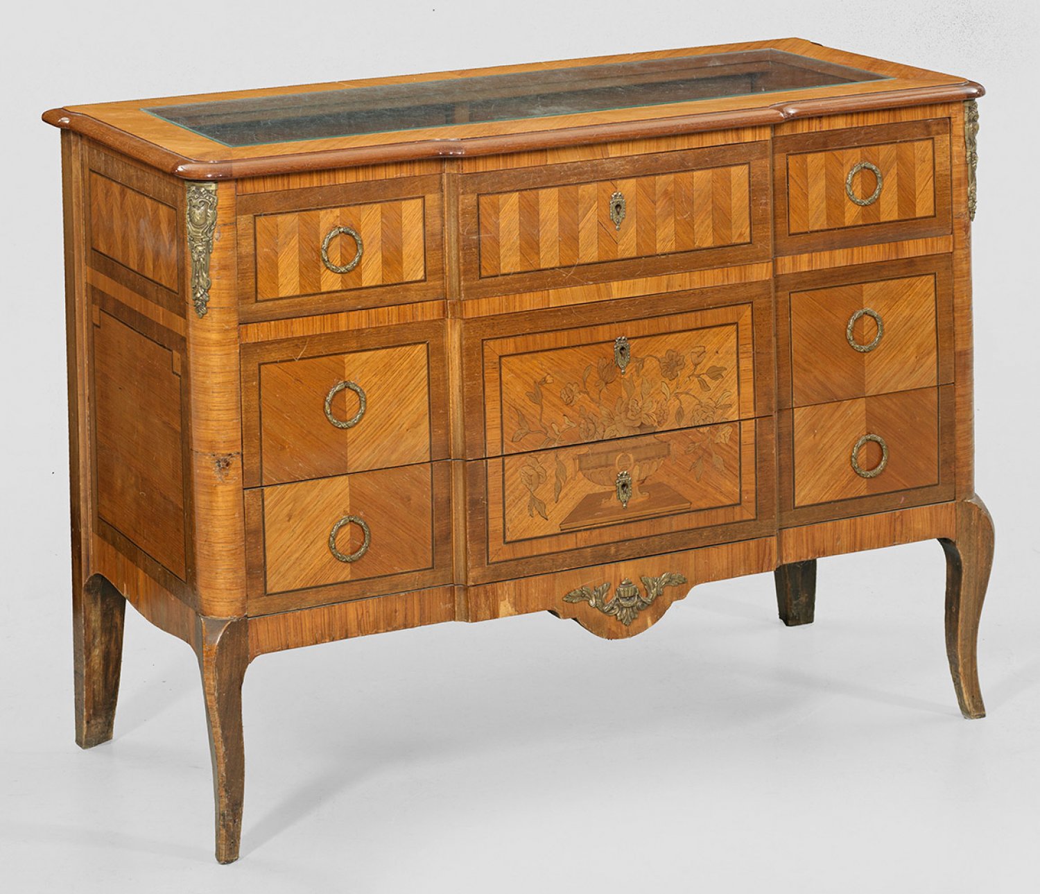 Rosenholz, furniert. Querrechteckig angelegter Korpus mit flachem Mittelrisalit, intarsierten Blüten, gerundeten Ecken und schauseitig drei Blendschubladen. Verglaste Deckplatte. Rückseitig später eingefügte Einteilung aus acht Schubladen. Ehemals elektrifiziert. H. 87 cm. 122 cm x 52,5 cm.