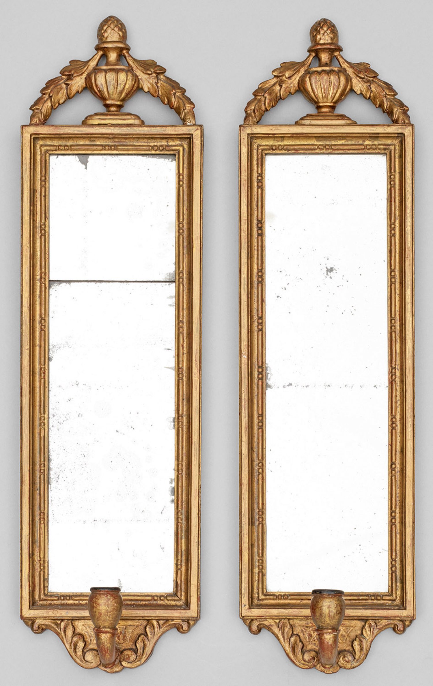 1-flg.; Holz, geschnitzt, gefasst und vergoldet. Gerade, hochrechteckige, umlaufend profilierte Spiegelrahmung mit Vasenbekrönung. Unterhalb davon ausgehend gebogter Leuchterarm. 1x zweigeteiltes Spiegelglas. Rest. mit Erg.; 61 cm x 16,5 cm.