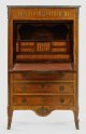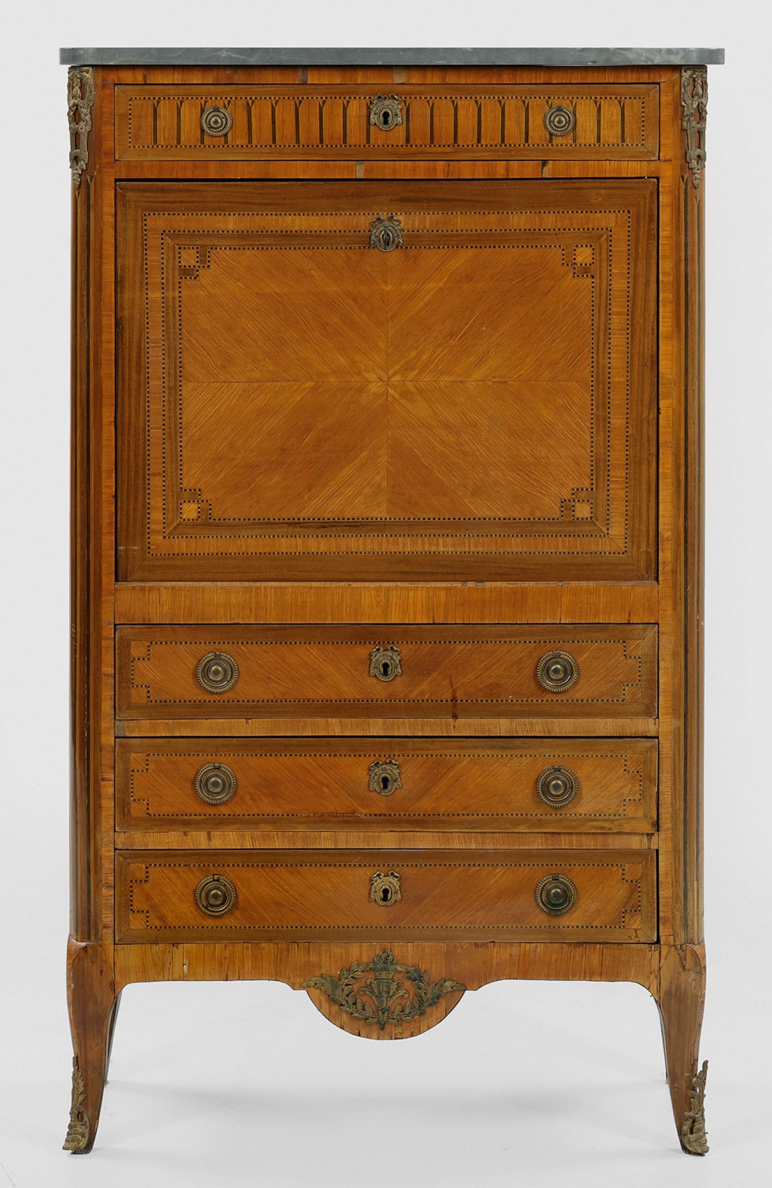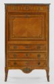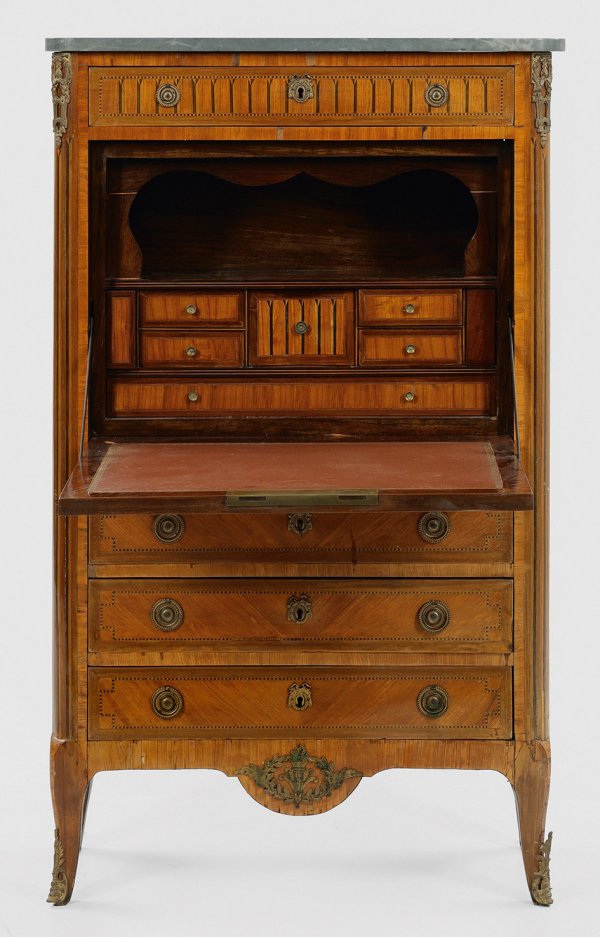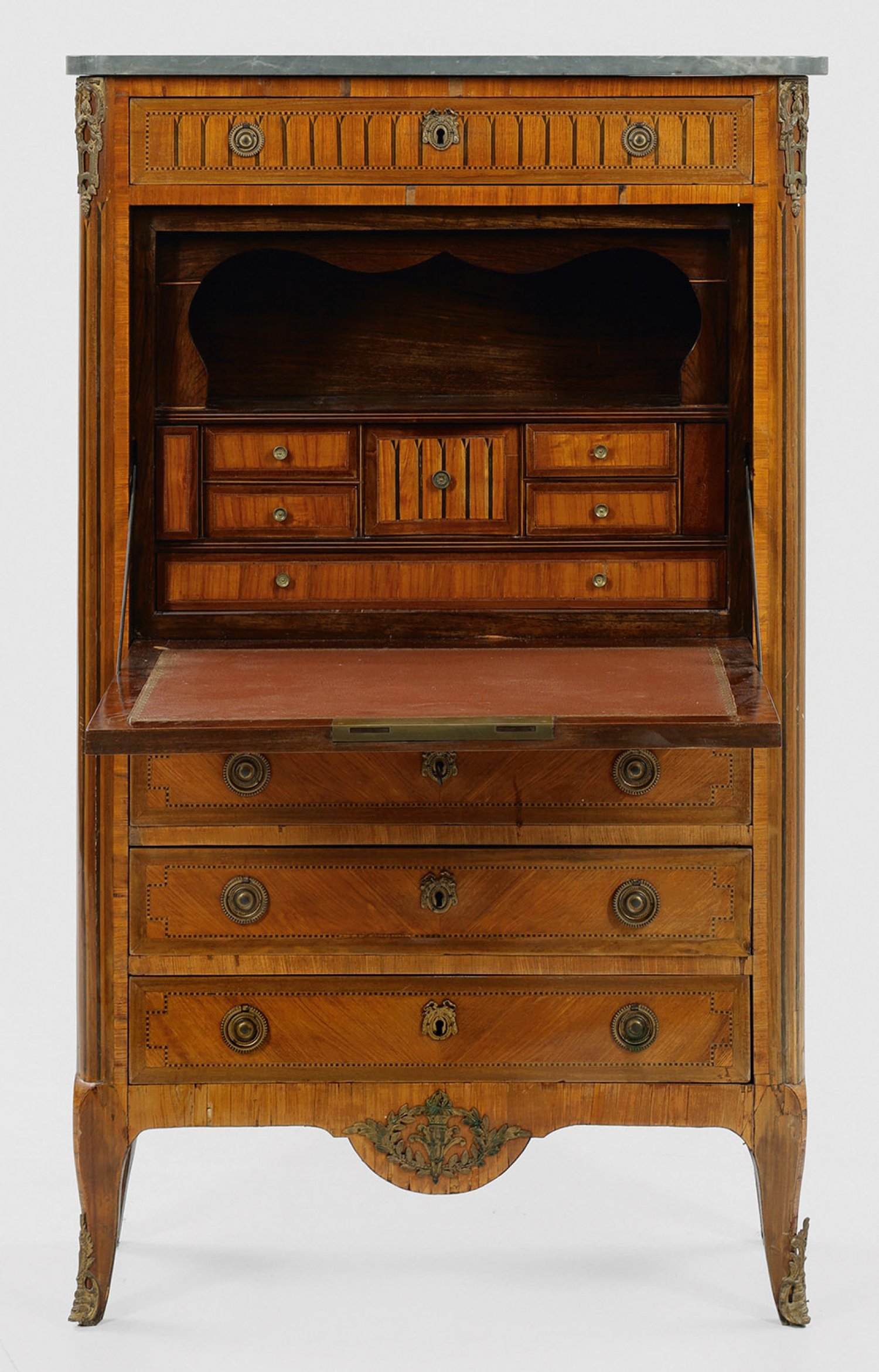 Mahagoni und Rosenholz, furniert. Gerader, hochrechteckiger Korpus, flankiert von gerundeten Ecklisenen mit Scheinkanneluren auf leicht geschweiften Beinen. In der gegliederten Front vier breite Schubladen sowie abklappbare Arbeitsfläche. Dahinter gestaffelte Facheinteilung. Flächendeckend breit gerahmte Furnierfelder, von Bandeinlagen begrenzt. Deckplatte aus grauem Marmor. Altersspuren. H. 148,5 cm. 90 cm x 37 cm.