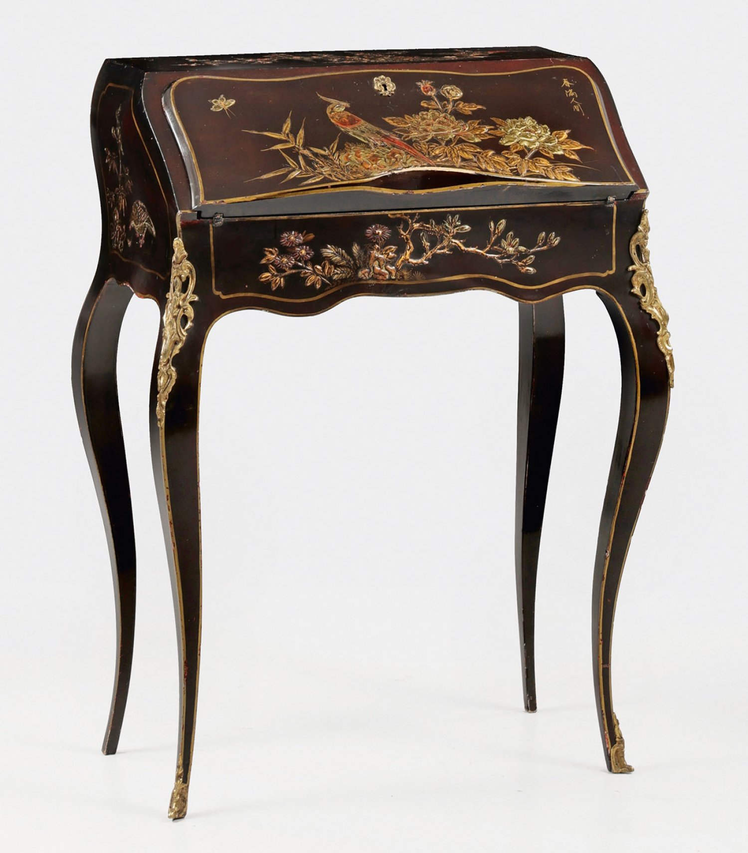 Flächendeckender rot-schwarzer Lackfond mit teilw. erhaben reliefierten, polychrom gestalteten und teilw. vergoldeten Dekorationen. Bombierter, passig geschweifter Korpus auf hohen, geschwungenen Beinen mit schräggestellter, abklappbarer Arbeitsplatte. Dahinter Facheinteilung. Dekor aus unterschiedlichen Vögeln sowie großen Päonienblüten und Prunuszweigen. H. 98 cm. 68 cm x 39 cm.