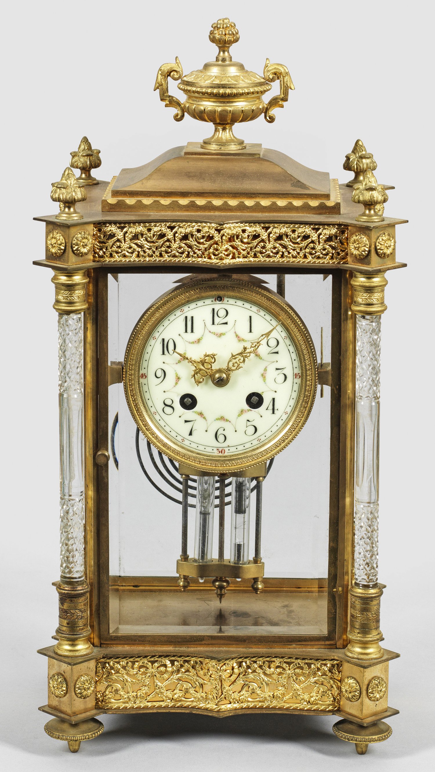 Bronze und Messing. Architektonisch gegliederter, allseitig verglaster Korpus, flankiert von facettierten Säulen auf passig geschweiftem Sockel mit breitem Relieffries. Geschweift ansteigender oberer Abschluss mit Vasenbekrönung. Werk mit Quecksilberpendel, Ankerhemmung sowie Halbstundenschlag auf Tonfeder. H. 41 cm. 21 cm x 16 cm.